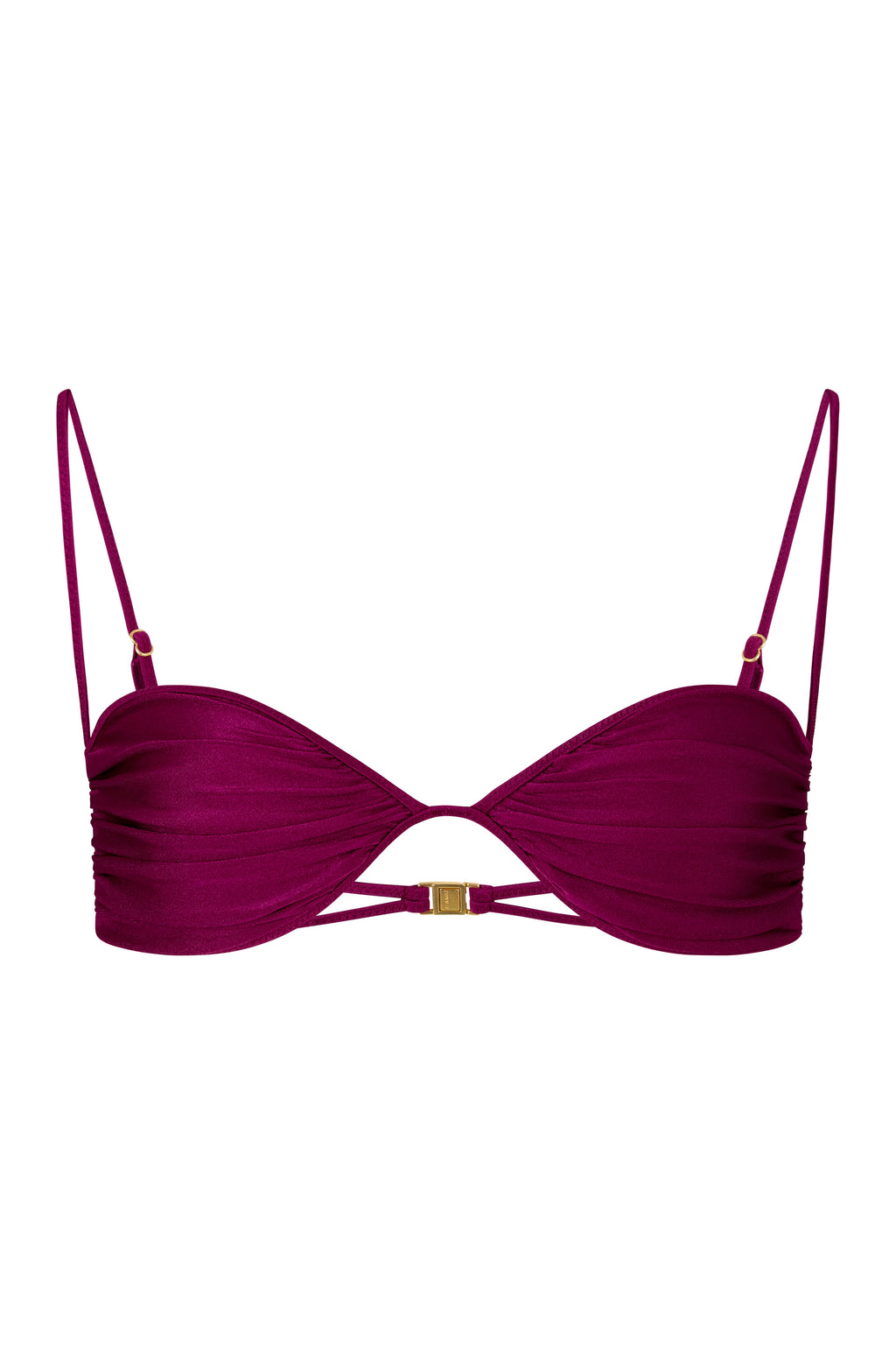 As part of Sommer Swim's AURELIA swimwear collection, this bralette style bikini top has luxurious features which includes brushed vintage gold hardware and ruched cup details. Mix and match the Ana Plum Caspia  bikini top with any Sommer Swim bikini bottoms.